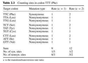 当然,在突变计数步骤中也可能出现更加复杂的情况,例如同一个密码子上出现了两个突变,例如 TTT 变为了 TCA,这种情况就要考虑多条进化途径: